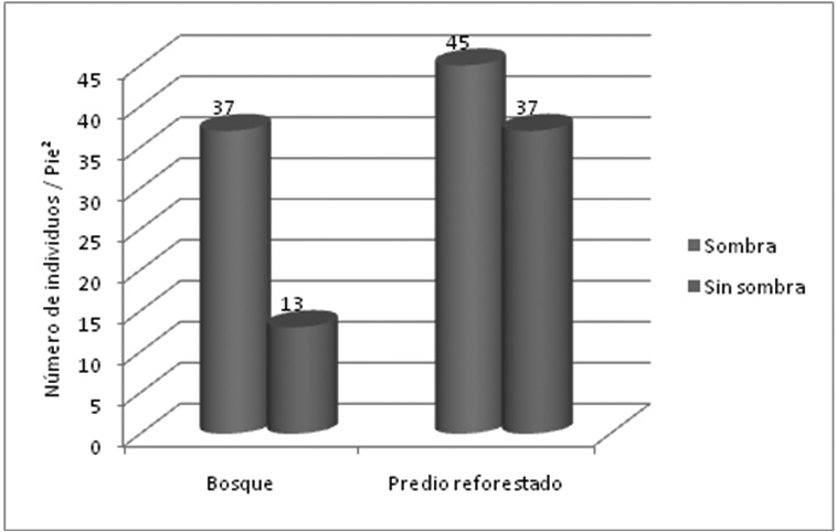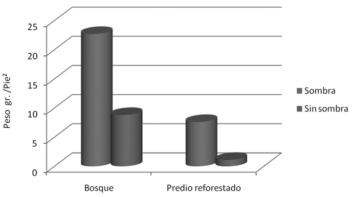 Contrario a los resultados encontrados en términos de abundancia entre los dos hábitat muestreados (Fig. No. 1), el hábitat de bosque secundario resultó el sitio donde se encontró el mayor peso de los individuos, mientras que el área reforestada presentó los organismos con un peso mucho menor. En ambos micro hábitats (con y sin sombra) la biomasa viva de los individuos del hábitat bosque presentó mayor peso que en el hábitat reforestado.