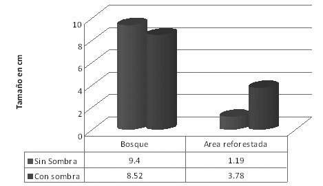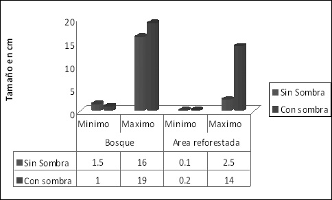 En la figura No. 3 se observa que el hábitat de bosque presentó los individuos de mayor tamaño, tanto en el microhabitat con sombra (19cm) como el de sin sombra (16cm), mientras que el tamaño de los individuos del área reforestada fue muy bajo, especialmente en el área sin sombra (2.5cm). A pesar de los resultados generales, es importante resaltar que en el microhabitat con sombra del hábitat área reforestada el tamaño máximo de los individuos (14cm) es similar a los resultados de ambos microhabitat del hábitat de bosque, por lo que se reafirma lo antes expuesto, que la sombra es un factor que influye directamente en el tamaño de estos organismos. Sin embargo, el tamaño mínimo en el hábitat área reforestada es considerablemente menor (0.1cm y 0.2cm) que en el hábitat de bosque, donde el organismo más pequeño registrado es diez veces mayor que en el microhabitat área reforestada.