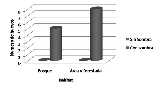 Los datos indican que existe una pequeña diferencia en el número de huevos encontrados en cada hábitat, siendo mayor el número de huevos en el hábitat reforestado (8 huevos total) con respecto al hábitat bosque, donde solamente se encontraron 5 huevos. Sin embrago, es importante notar que en ambos hábitat se encontraron huevos de lombrices únicamente en los micro hábitat con sombra, mientras que en los sitios sin sombra la presencia de huevos fue nula (Fig.3).