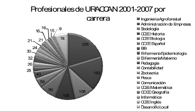 La URACCAN en su trayectoria institucional de Educación Superior hasta el 2007 ha formado y titulado a 1132 profesionales en el nivel de licenciatura en 19 carreras. El 62% corresponde al sexo femenino, papel de relevancia en la consolidación de estructuras igualitarias de oportunidades entre mujeres y varones en el ámbito de la formación académica.