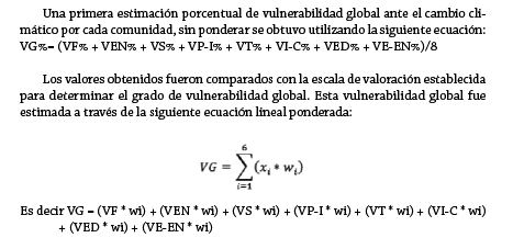 Se utilizó fuentes secundarias respaldadas con resultados de información primaria para realizar la caracterización socioeconómica y biofísica, e información primaria para describir la percepción comunitaria y el alcance de las instituciones gubernamentales y no gubernamentales locales. Para el análisis de vulnerabilidad, la vulnerabilidad global se dividió en vulnerabilidad física (VF); económica (VEN); social (VS); política-institucional (VP-I); técnica (VT); ideológico-cultural (VI-C); educativa (VED) y ecológica-eventos naturales (VE-EN). Para cada ángulo de vulnerabilidad se definió variables e indicadores considerando las características particulares de la zona de estudio. Los indicadores fueron validados y caracterizados retomando la propuesta de Watler (2008), haciendo uso de una escala de ponderación lineal de 0 a 4, es decir muy baja o nula (0), baja (1), media (2), alta (3), muy alta (4). Se parte de la premisa que entre mayor es la valoración asignada mayor es el grado de vulnerabilidad para esa variable.