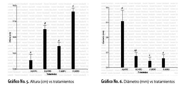 La prueba mostró diferencia estadística en las variables: altura y diámetro versus los tratamientos (p=<0.0001) y (p=0.0187); despuntando el tratamiento D, con las mayores medias (240.21) de Altura (gráfica No. 5) y (207.66) de diámetro (gráfica No. 6).