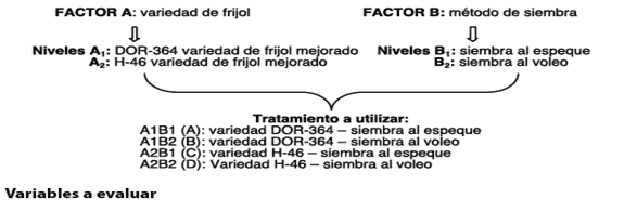 El ensayo fue un diseño bifactorial en bloques completos al azar (DBCA), con 4 tratamientos y 3 repeticiones. Se estudiaron 2 factores; el factor A y el factor B, y fue analizado bajo un modelo lineal de DBCA[8], en inicio porque, el diseño no presentó las unidades experimentales adecuadas y en segundo, porque se pretendió analizar un factor por separado y, no el cambio de un factor según los niveles de los otros factores o su interacción. A continuación se sintetiza.