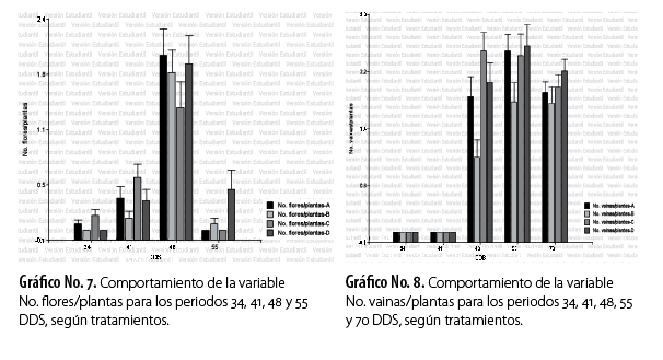 En cuanto a la formación de vainas inicio a los 48 DDS, despuntando el tratamiento C (A2B1), en relación a los demás tratamientos. Del mismo modo, a los 55 y 70 DDS se observa entre los tratamientos A (A1B1), C (A2B1) y D (A2B2) una semejanza en la cantidad de vainas formadas por plantas, no así, en el tratamiento B (A1B2) (gráfico No. 8).