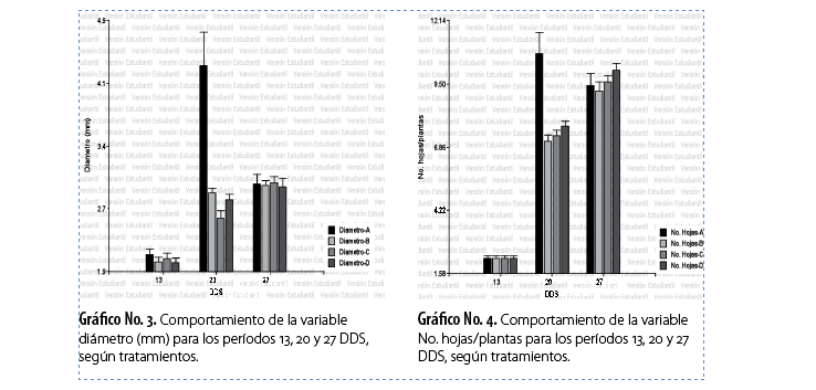 En el gráfico No. 3, muestra similitudes diamétricas en los cuatro tratamientos para los períodos 13 y 27 DDS, a excepción del período 20 DDS, donde despunta la media del tratamiento A (A1B1). Los resultados ponen de manifiesto, que la variedad diamétrica tuvo efecto entre los tratamientos, lo que posiblemente se deban a las labores agrícolas establecidas, destacándose el control continuo de malezas y el suministro de agua.