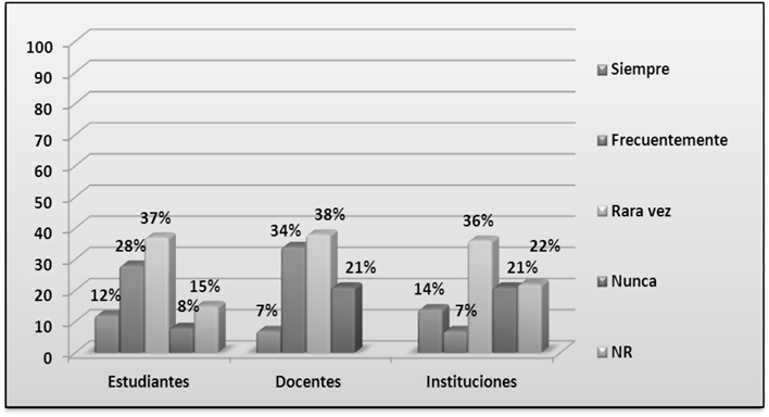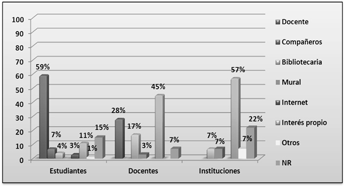 El 85% de estudiantes, 100% de docentes y el 79% de los encuestados de las instituciones, expresan que se tiene conocimiento de la existencia de investigaciones monográficas en la biblioteca “Luz en la Selva”, lo que concuerda con autoridades universitarias y responsable de biblioteca, cuando expresan que la biblioteca es un referente para consultas de información no sólo a nivel interno de la universidad, sino a nivel municipal siendo esta la biblioteca más grande de Nueva Guinea, con mayores recursos bibliográficos, infraestructura, tecnología y accesibilidad.