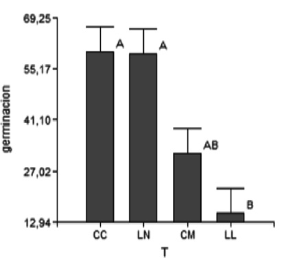 Se detectaron diferencias significativas (p=0.011) en el análisis de varianza para la variable germinación. Hubo mayor germinación en los tratamientos de cuarto creciente y luna nueva, con valores entre 60 y 59.5% respectivamente (grupo A). La fase de cuarto menguante tuvo un 32% de germinación (AB), mientras que las semillas sembradas en luna llena fueron las que presentaron menor porcentaje de germinación (15%) (grupo B).