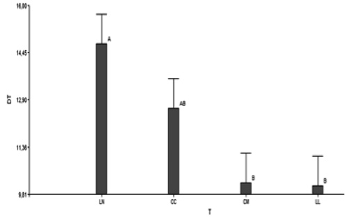 Con respecto a la clorosis, no se encontró diferencias significativas en el primero ni en el segundo muestreo. A los 60 días de sembrado el maíz, se encontró diferencias significativa en el daño causado por clorosis entre los tratamientos (p=0.0257). Las parcelas sembradas en luna nueva difieren con respecto a las demás fases lunares en términos del porcentaje de daño (46.25%) formando este tratamiento la categoría B, según la prueba de Tukey. cuarto menguante y luna llena (18.75 y 12.5%) respectivamente forman la categoría AB y finalmente cuarto creciente forma una tercera categoría (A) con el menor grado de afectación (7.5%).