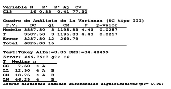 Para evaluar las diferencias entre tratamientos según las variables a medir, los datos fueron sometidos a un análisis de varianza (ANDEVA), y separación de media por prueba de rango múltiples de Tuckey con α = 0.005. Para ello se utilizó el programa InfoStat versión 2010.
