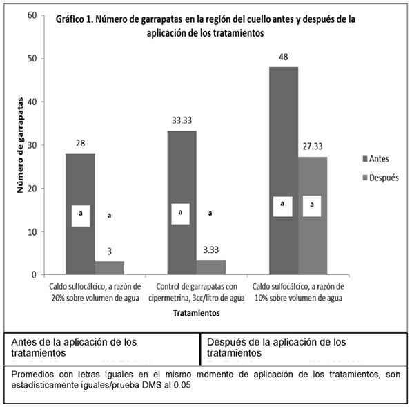El análisis de varianza (ANDEVA) para el número de garrapatas en la región del cuello antes y después de la aplicación de los tratamientos demuestra que no hay efecto significativo de los tratamientos evaluados (α=0.05), es decir estadísticamente todos los tratamientos son iguales entre sí (Figura No. 1), sin embargo al hacer un análisis numérico se observa que la cipermetrina a razón de 3ml/litro de agua y el caldo sulfocálcico a razón de 20% sobre volumen de agua son los que eliminan el mayor número de garrapatas (90 y 89% respectivamente), el caldo sulfocálcico a razón de 10% sobre volumen de agua logró controlar solamente el 43% de las garrapatas en la región del cuello.