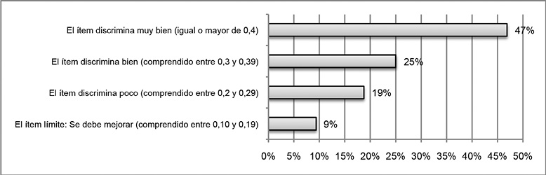• La idoneidad evaluadora de un instrumento es el índice de discriminación de un ítem en el instrumento. Un ítem puede ser adecuado cognitivamente, pero no diferenciar (por ser demasiado fácil) los estudiantes que tienen un mayor o menor conocimiento del concepto. El índice de discriminación encontrado hacia referencia que el los ítems poseen una buena correlación lo que indica que los estudiantes alcanzaron buenas puntuaciones. Esta idoneidad es un componente de la idoneidad instruccional en cuanto que uno de los objetivos de la instrucción es la función evaluadora (Godino, 2011).
