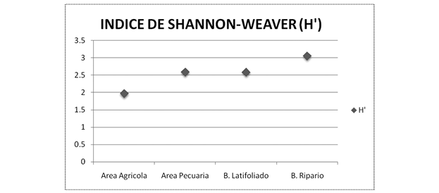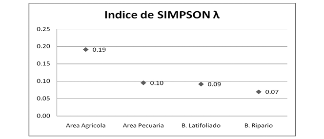 Por otro lado al comparar los índices de diversidad, se encontró una similitud en sus resultados debido a que el índice de Shannon muestra que existe una diversidad considerable en el laboratorio natural y que el bosque de galería es el área en donde más diversidad se presentó. El índice de dominancia de Simpson nos reflejó que no existe una dominancia por parte de las especies en el laboratorio y que en el bosque ripario fue el más diverso pero si se presentó dominancia en el área agrícola por parte de las especies al igual que poca diversidad según los resultados del índice de Shannon.