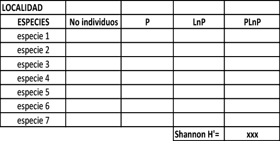 En el caso del índice de Shannon al igual que en el índice anterior, se elaboró una tabla en excel para cada uno de los ecosistemas a como se muestra a continuación: