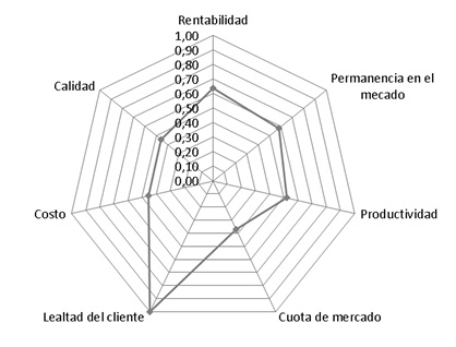 Al obtener el valor de los indicadores de competitividad en una escala de 0 a 1, los valores iguales o menor a .05 son a los que se debe procurar mayor atención. En ese sentido, las organizaciones deben poner especial atención a; Calidad, Productividad, Cuota de mercado, Costos y Permanencia en el mercado; para mejorar su competitividad. (Ver Figura 5).