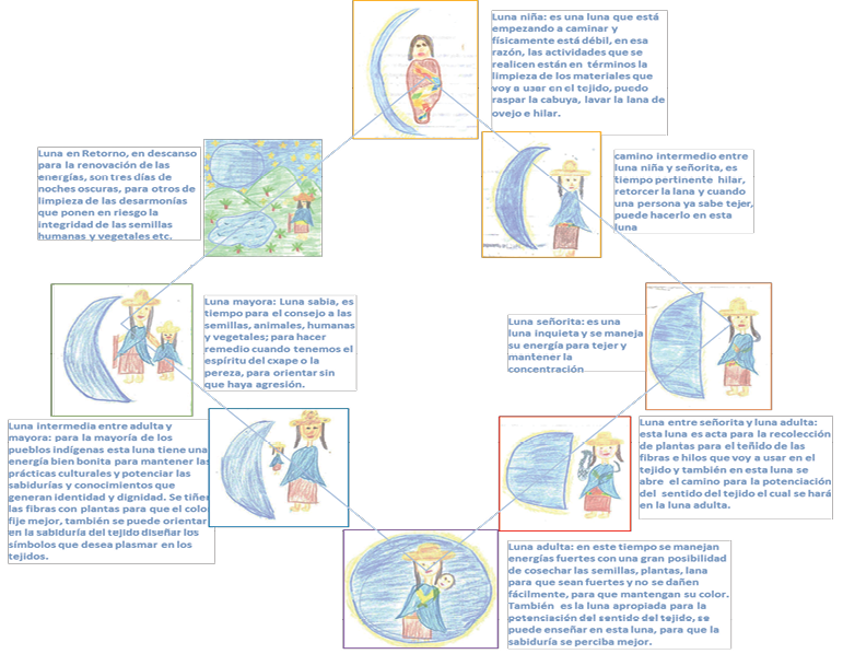 Los ciclos avanzan haciéndose más complejos el requerimiento cultural tanto para hombres como para mujeres reconociendo las dinámicas de trasfondo familiar y comunitario, ya que los tejidos tienen la función de aportar en el campo sociocultural de referencia para las otras generaciones.