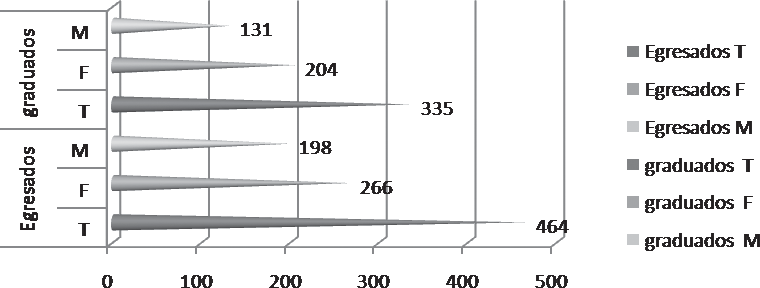 Con relación a estudiantes egresados\as, se tiene una cantidad de 464, corres- pondiendo 260 a mujeres y 204 hombres. De este total, 335 lograron titularse en las diferentes carreras, corresponden 185 mujeres y 150 hombres. Hay curiosas diferen- cias por sexo y niveles de éxito. Se ha dicho que menos mujeres concluyen estudios superiores; no obstante, son más eficientes en materia de titulación que los hombres Se destaca que si bien es cierto que las mujeres son las que más desertan, también son las que más logran titularse.