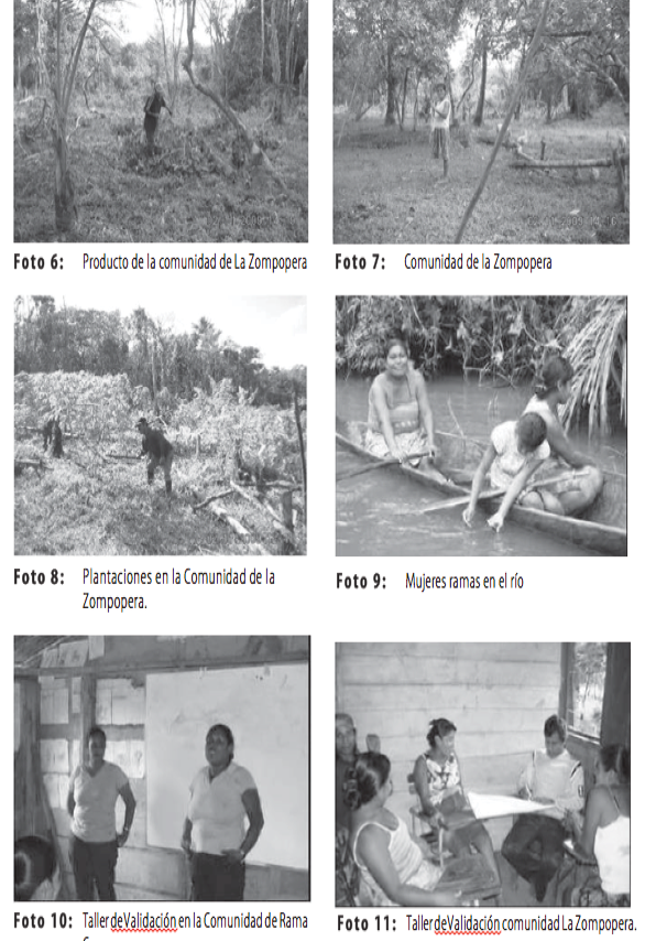 Fase IV: Se desarrolló el trabajo de campo, lo cual consistió en la aplicación de los ins- trumentos mejorados en la fase anterior. Esta fase se ejecutó en dos giras de campo de una semana aproximadamente en ambas comunidades. En este período, además de los grupos focales y las entrevistas, la observación, la permanencia en las comu- nidades y su cotidianidad permitió profundizar algunos aspectos sobre el aporte de las mujeres ramas en los diferentes ámbitos.