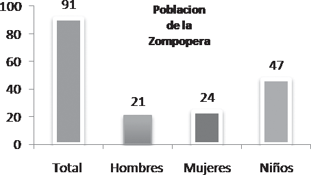 En el caso de la comunidad de la Zompopera el total de familias está en corres- pondencia con el número de viviendas existentes. Es decir 24 familias en 24 viviendas y con un promedio de 4 personas por vivienda, según los datos del Gobierno terri- torial Rama. Sin embargo, se pudo constatar que en la comunidad existe un tipo de migración interna intercomunitaria. Es decir, al llegar a las comunidades, muchos de los informantes claves como por ejemplo lideres comunitario, se encontraban en Bluefields, Rama Cay u otra comunidad del territorio Rama. En este particular, se puede mencionar que es poco preciso el censo del gobierno territorial Rama, ya que los líderes comunitarios y algunos miembros de la comunidad plantean que la población promedia está arriba de las 175 personas.