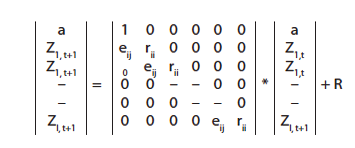 Suponiendo una población de z clases diamétricas (z1, z2... zt) en el año t, en donde zt es la clase diamétrica de los árboles de cosecha, la proyección de la población en el año t+1 con la ecuación nt+1=M*nt+R en forma matricial es: