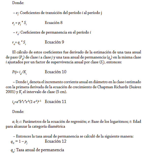 Diversas aplicaciones de estos modelos matriciales para árboles en sistemas agrofo- restales han sido desarrolladas. Somarriba (1984) empleó un modelo de matrices de transición para describir y simular la dinámica de la población de Goethalsia meiantha y facilitar la interpretación sucesional de esta especie y del bosque en su conjunto.