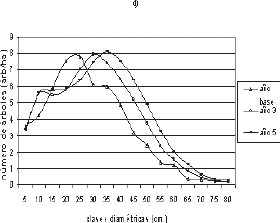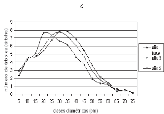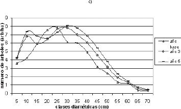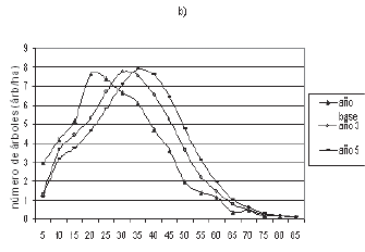 proyección a cinco años con los datos observados de la distribución diamétrica (árboles ha-¹), 2) 100% de sobrevivencia en las clases diamétricas inferiores (dap < 45 cm) y 3) incrementos del 50% en las tasas de reclutamiento.