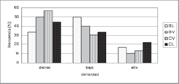 Cuando se compararon las densidades de cedro por condición de crecimiento V y L, no hubo diferencias entre las mismas; sin embargo, las densidades de cedro en V presentan un área basal mayor en un 20% que las densidades de cedro en L.