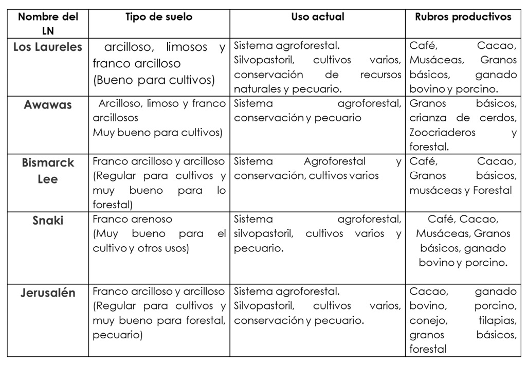 El laboratorio natural Awawas del Recinto Las Minas, tiene suelos de tendencia limosos caracterizados por drenaje regular y formación de terrones fáciles de trabajar lo que permite establecer sistemas productivos agroforestales y agroecológicos permitiendo el establecimiento de otros sistemas productivos, pero por razones de ubicación no se pueden implementar. Cuentan con grandes oportunidades de crecimiento respaldados por la tenencia de títulos de propiedad registrados, salvo el de Jerusalén en Nueva Guinea que solo cuenta con un certificado de posesión legal (Titulo en gestión); Además tienen una cuenta bancaria que sirve para los movimientos monetarios propios del laboratorio natural, salvo Jerusalén en Nueva Guinea y Bismarck Lee en la Extensión Waslala que no lo han hecho, pero está en gestión.