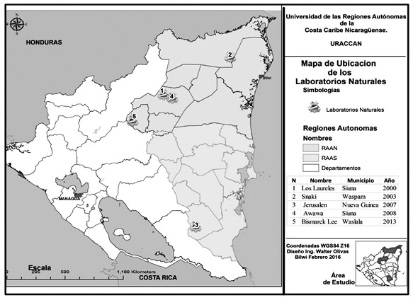 Se ubican en la Costa Caribe nicaragüense, específicamente en los municipios de Waspam, Siuna, Waslala y Nueva Guinea. La adquisición de los mismos comienza en el 2000 con el Laboratorio Los Laureles (Siuna), seguidamente Snaki (Waspam) en el 2003, posteriormente Jerusalén (Nueva Guinea) en el 2007 y en el 2008 Awawas (Siuna). Concluyendo, en el 2013 con la compra del laboratorio natural Bismarck Lee en Waslala. Véase figura 1.
