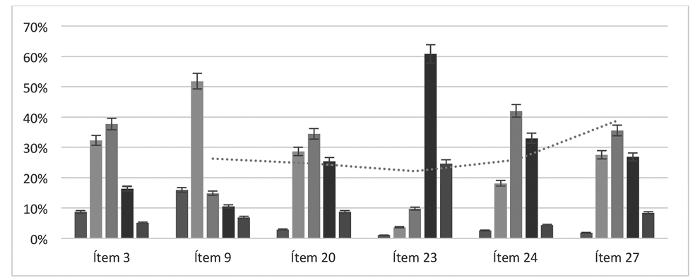 Con un máximo de 35 puntos se presenta el componente dificultad hacia la estadística, la media de la muestra se situó en 22,37 con una mediana de 22 puntos. El error típico de la media fue 0,20, junto con una desviación estándar de 3,46. La moda fue de 21 para un rango de 19. El coeficiente de variación obtenido en el componente dificultad fue de 12,02%. Destacar que en este componente los ítems oscilan entre 3,55 el ítem 22 (la estadística implica mucho cálculo) y 2,71 el ítem 28 (la mayoría de la gente debe cambiar su manera de pensar para hacer estadística). En definitiva, estos resultados muestran el grado dificultad que sienten el estudiantado en procesos de formación para profesor. Véase la tendencia del componente dificultad en la figura no. 5.