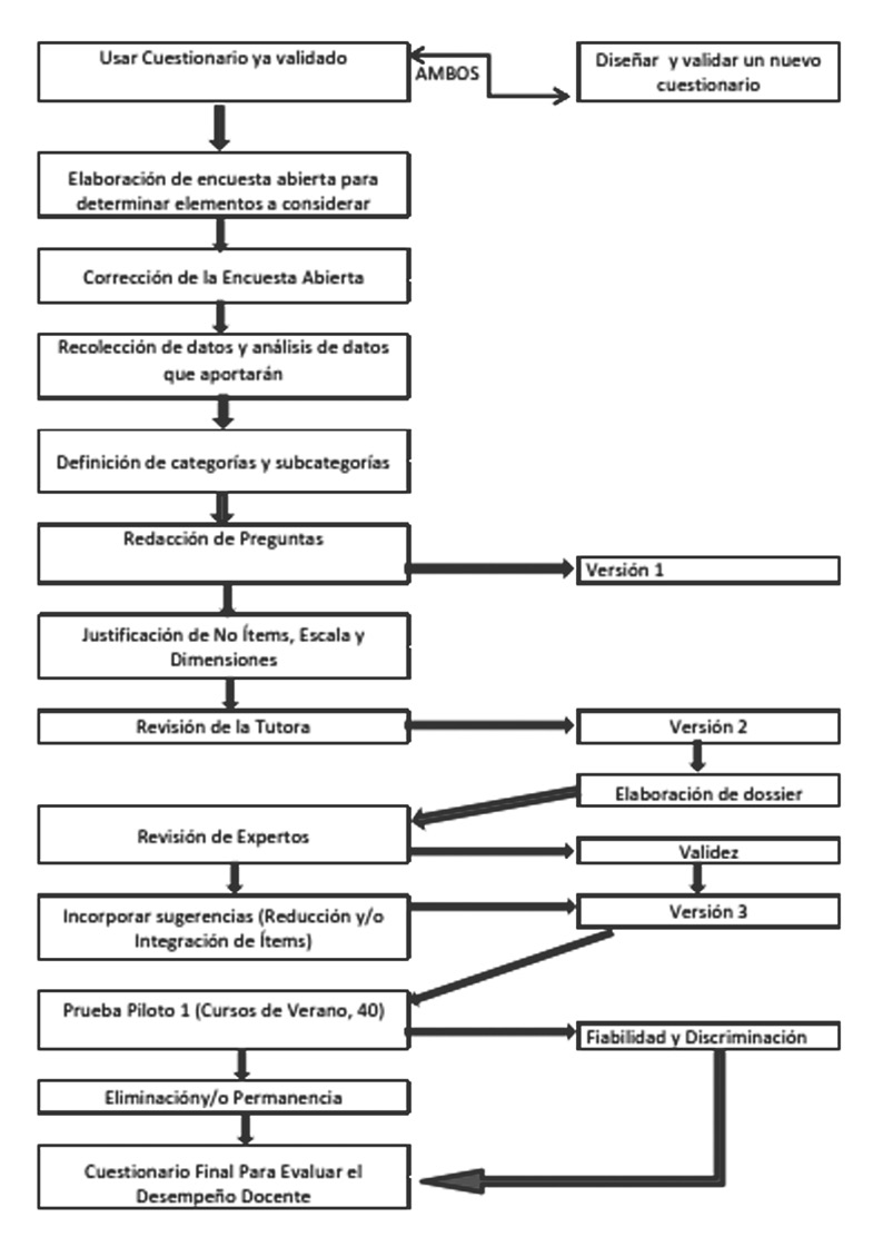 Para la construcción del cuestionario se ha realizado una exhaustiva revisión en veinte investigaciones sobre la propuesta de modelos de evaluación al profesorado o instrumentos para valorar la actuación del mismo. Un aspecto a destacar en la construcción de este cuestionario fue la utilización de una escala de medición acerca de la opinión del desempeño docente, para lo que se procedió a revisar los trabajos mencionados anteriormente.