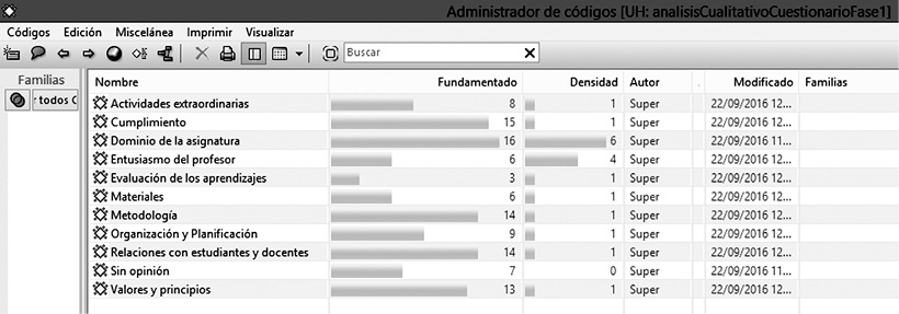 Se consideró más práctico dar conocer los resultados enumerando las entrevistas, debido a que el análisis en el programa ATLAS.ti fue realizado con base a un solo documento primario donde se copiaron todos los resultados de las 31 entrevistas aplicadas. Así se observa que se han tenido que agregar tres categorías, las que se denominaron “cumplimiento”, “relaciones con estudiantes y profesores”, y, “valores y principios”. De acá es que se termina de construir el sistema categorial, que ahora ya no únicamente es deductivo, sino también inductivo. Los nombres de las categorías han ido cambiando y surgieron de la lectura de todas las entrevistas.