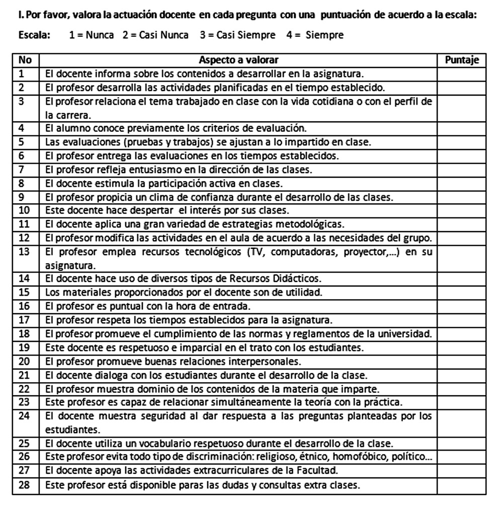 La elección de la escala fue quizás el punto en el que más se ha pensado la forma que debía tener; porque de acuerdo a la revisión hecha, casi un 90 por ciento de las escalas analizadas usan entre 4 y 5 adjetivos tipo Likert, medida en intervalo u ordinal; sin embargo, la mitad de ellas presenta un sesgo positivo, por lo cual existe evidencia que han sido ligeramente alteradas para que los desempeños finales de los profesores sean benévolos, esta situación no contó con nuestro respaldo, por tal razón, esta investigación está inclinada por una escala tipo Likert de 4 adjetivos y balanceada, es decir, sin ningún tipo de sesgo y con medición de intervalo, quedando compuesta así: 1= Nunca 2= Casi Nunca 3=Casi siempre 4= Siempre.
