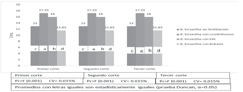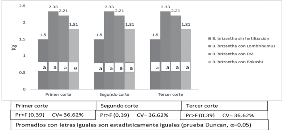 En la figura 2 para la producción de materia seca refleja que durante los tres cortes del pasto hay efecto significativo, en el tercer corte los tratamientos con Lombrihumus y Bokashi tienen los mayores rendimientos, esto debido a que su incorporación al sistema radicular y vascular es más lenta, considerando el grado de mineralización de los elementos nutritivos que contienen los abonos orgánicos. Los datos obtenidos tienen similitud con Aguilar (1997) quien con frecuencia de corte de 27 días obtuvo 2383.1 kg/ha, superan los reportados por Roig (2010) quien indica rendimientos de 8 a 10 t/ha por año. De acuerdo a Prado (2004) con fertilización orgánica obtuvo 2490.90 kg/ha/corte, siendo inferiores a los del actual estudio.