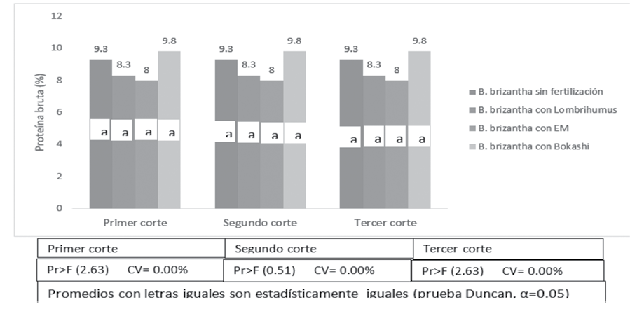 Contenido de proteína bruta. El contenido de proteína en Brachiaria brizantha (figura 7) no está determinado por el tipo de abono que se aplique, al mostrar una sola categoría estadística para todos los tratamientos.