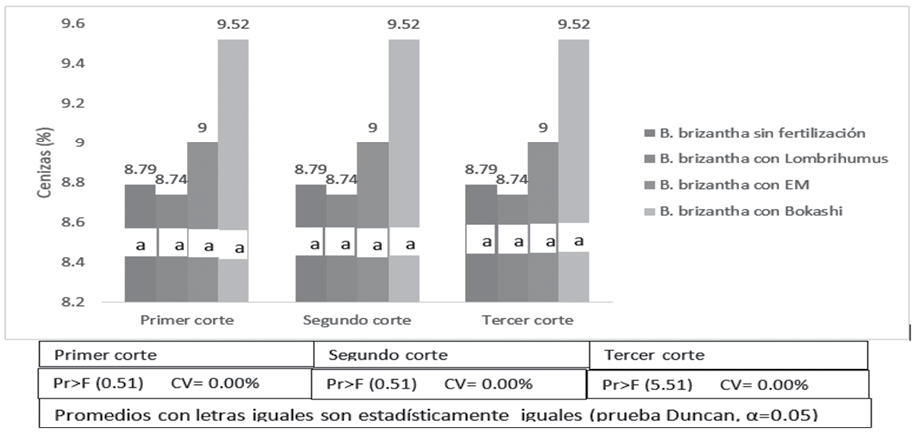 Contenido de cenizas. La figura 8, muestra una sola categoría estadística para todos los tratamientos. Las pasturas poseen una concentración de ceniza que oscila entre 7 a 13 % en su contenido de materia seca (Trujillo, 2012). De acuerdo a Canchila (2009) la ceniza en Brachiaria presentó porcentajes entre 5,5 y 9,0%.