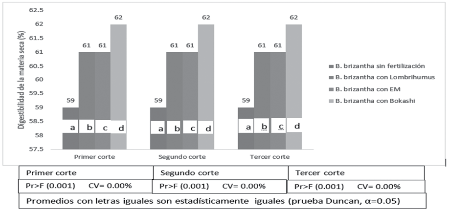 Por otro lado, Pérez (2013) reportados digestibilidad en el pasto Brachiaria brizantha de 61. 8% con una frecuencia de corte de 35 días, muy similar a los datos obtenidos, la digestibilidad promedio de forraje producido por esta especie es de 66%, con un rango que puede variar entre 56 y 75 % dependiendo de la edad del rebrote.