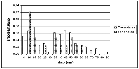En este escenario, considerando la sobrevivencia del 100% de los individuos con dap ≤ 45 cm (Cuadro 5) se obtiene que en todos los sistemas agroforestales habrán incrementos en el ICAVc y el IPAvc, siendo los bananales los de mayores incrementos (13% más que los cacaotales), sin embargo, los incrementos son bajos con respecto a la proyección con los datos observados.