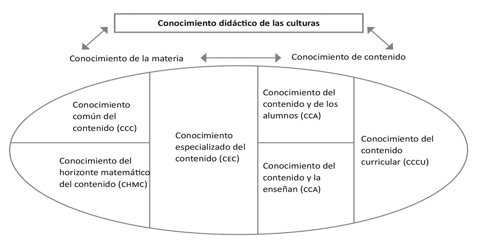 • Conocimiento didáctico de las culturas. Es el conocimiento de potencial didáctico que las culturas confluyen y constituyen el entorno social del aula ofrecen al proceso de enseñanza de las matemáticas. En este marco el uso de las TIC en la enseñanza de las matemáticas es considerado como un aspecto a abordar dentro del conocimiento del contenido y la enseñanza; su incorporación tiene que ver con la reflexión sobre las posibilidades de múltiples representaciones y medios de comunicación y exploración matemáticas.