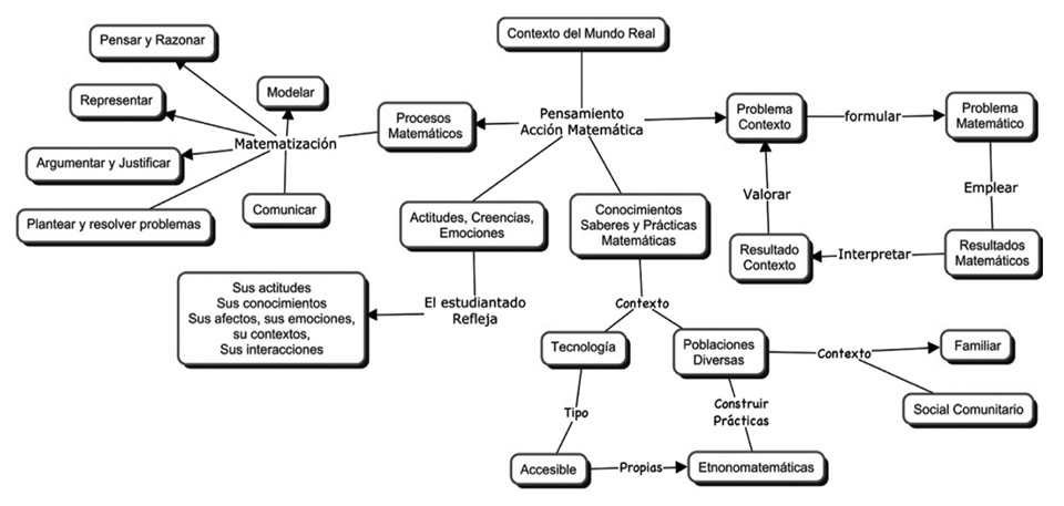También, se tiene que tomar en cuenta el proceso de matematización, este consiste en traducir los problemas desde el mundo real al matemático, por lo que se sustenta en varios subprocesos entre ellos: pensar y razonar; argumentar, justificar; comunicar; representar; modelar; representar; plantear y resolver problemas (NCTM, 2000; TIMSS, 2003; OECD, 2005). Los procesos matemáticos formalizan la resolución de problemas matemáticos. Según Pajares, Sanz y Rico (2004) su utilidad se concreta en establecer capacidades y habilidades específicas que ayudan a modular los objetivos, a establecer tareas escolares y caracterizar las propuestas de trabajo y las evaluaciones. Los contextos personal-familiar; social-comunitario; profesional-especializado; científico-tecnológico son aproximaciones fenomenológicas que constituyen ejes centrales que dotan de sentido al conocimiento matemático (Rico, 2006). Es decir, la variable contexto permite establecer la localización de un problema en términos de fenómenos de los que surgen la situación problemática considerada (OECD, 2004).
