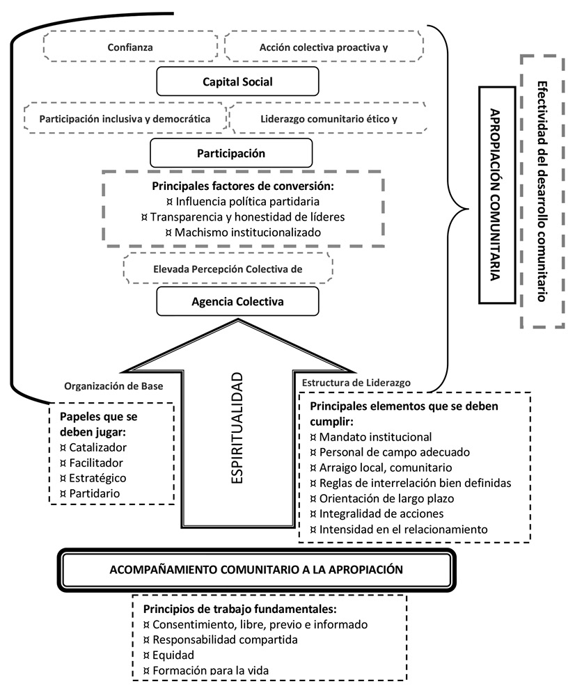 En la concatenación de los aspectos antes mencionados, el proceso que conlleva a la apropiación comunitaria esta mediado por factores de conversión. En las comunidades estudio de caso, existen tres factores de conversión determinando el tránsito de agencia colectiva a los niveles de participación y capital social: la influencia política partidaria, la transparencia y honestidad de los líderes y lideresas comunitarias, y el machismo institucionalizado en las estructuras comunitarias. Estos factores tienen una particular incidencia en las variables de confianza, liderazgo, acción colectiva y tipo de participación. La transparencia y honestidad de los líderes, lideresas y autoridades territoriales tienen un gran peso en estas variables, al determinar la calidad de los procesos de toma de decisión y elección en colectivo, confianza y capacidad de movilización comunitaria. La influencia política partidaria a su vez incluye en la calidad del liderazgo comunitaria, especialmente en términos de su legitimidad, sensibilidad y unidad en la comunidad. El machismo institucionalizado afecta especialmente los niveles de confianza y acción colectiva de las mujeres, teniendo un efecto a nivel general de la comunidad.