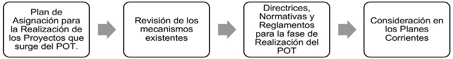 Consiste en la creación de diferentes medios y herramientas (directrices, normas, reglamentos, mecanismos de gestión, planes de inversión), que garantizan la aplicación de manera efectiva de las declaraciones del nuevo POT, Zúniga H. y Lippert T. (2008).