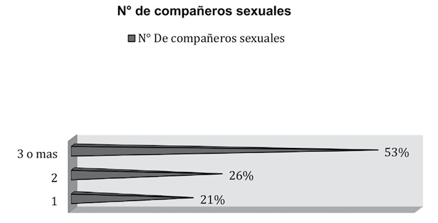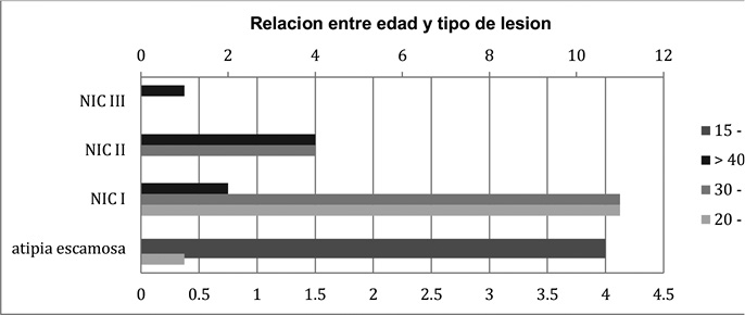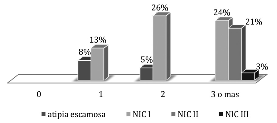 En el análisis de la relación existente entre el número de parejas y el tipo de lesión se observó que las mujeres con mayor número de parejas sexuales es decir 3 o más (53%), presentaron en su mayoría lesiones de leves a severas con NIC I 29%, NIC II 21% y NIC III (3%) a excepción de las atipias escamosas lesiones de bajo grado, lo que hace énfasis en que la promiscuidad es un factor de gran importancia para el desarrollo de modificaciones en epitelio cervical, ya que se debe tener en cuenta que la mujer desconoce los antecedentes sexuales de cada pareja con la que sostuvo relaciones sexuales así como ( cantidad de parejas, antecedentes de ITS, parejas anteriores con VPH o algún tipo de lesión cervical, el uso de métodos de barrera e incluso higiene personal).