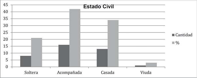 2. Estado civil: Con respecto al estado civil la mayoría de las mujeres estudiadas mantenían uniones de hecho estables o acompañadas con un 42%, esto representa a 16 mujeres. Un 34% equivalente a 13 mujeres son casadas y 21% que corresponde a 8 mujeres solteras.