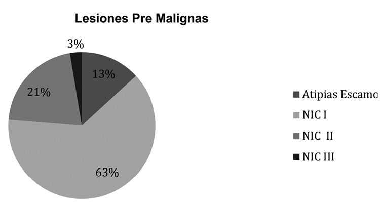 Entre los resultados es que la principal lesión pre maligna de cáncer cervicouterino son las neoplasias leves, es decir NIC I con un 63%, seguido de los NIC II con un 21%, y atipias escamosas en las que se incluyen las infecciones por VPH con un 13%. A pesar de los diferentes factores de riesgo se han logrado captar en lesiones tempranas, por lo que para lesiones severas NIC III se encontró un 3%.