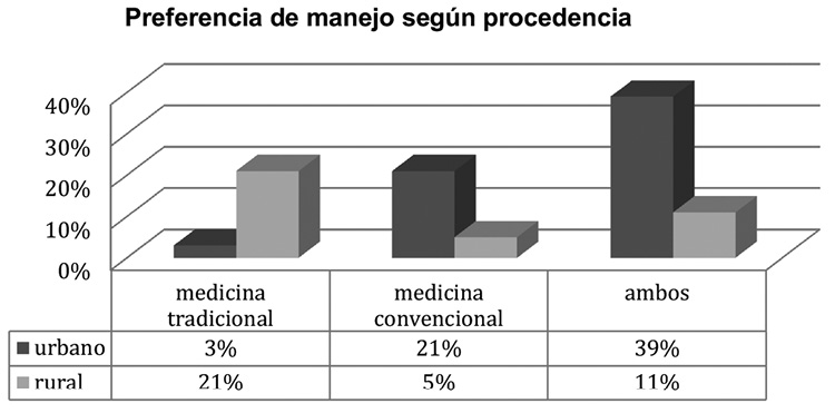 Sin embargo, un 21% tanto rural como urbano se encuentran en que los de procedencia rural tienen tendencia a preferir ser tratadas tradicionalmente debido a la relación de confianza y seguridad que conservan con sus médicos tradicionales y parteras. El mismo porcentaje, pero de procedencia urbana opta por ser tratadas convencionalmente ya que refieren que hay problemas de salud que deben ser tratados de la forma medica convencional, aun así, conservan su cosmovisión del proceso salud enfermedad.