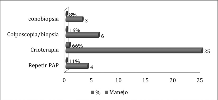 Las lesiones pre malignas así como puede revertirse espontáneamente a través del sistema inmune, así mismo pueden desarrollarse, es por eso que en su mayoría se les dio seguimiento a través de colposcopia medio por el cual a la vez se puede realizar biopsias 16% y a veces se mantiene manejo expectante es decir en un 11% a las mujeres se les envió a repetir el PAP, sin embargo en su mayoría se les realizo crioterapia en un 66% un método poco invasivo, en su minoría se les realizo cono biopsias este procedimiento tiene dos acciones es un método diagnostico pero también es tratamiento en lesiones pre malignas severas es decir NIC III, un 8% de las mujeres fueron sometidas a este procedimiento.