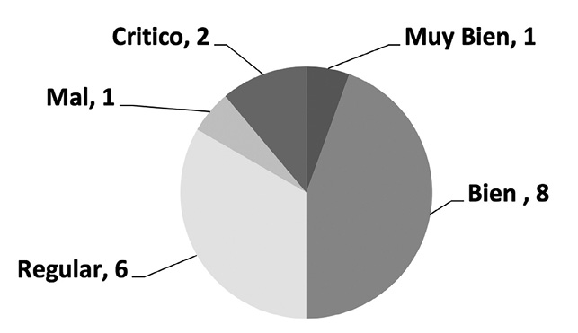 Figura No.1. Número de arrecifes ubicados en cada rango, según resultado de indicadores. Cayos Miskitos.