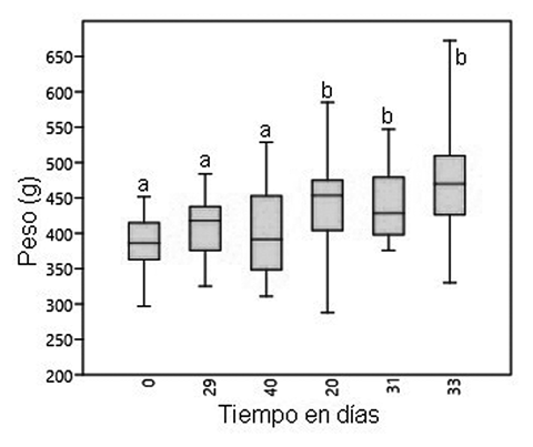 Figura No. 2. Peso de la langosta (Panulirus argus), cultivada en jaulas flotantes en el Refugio de Vida Silvestre Cayos Perla, Nicaragua, del 21 de diciembre de 2018 al 23 de mayo de 2019. a y b son grupos estadísticamente diferentes p < 0.01.