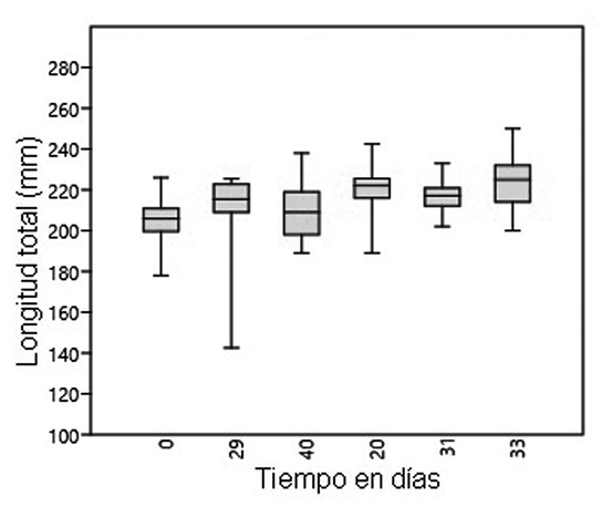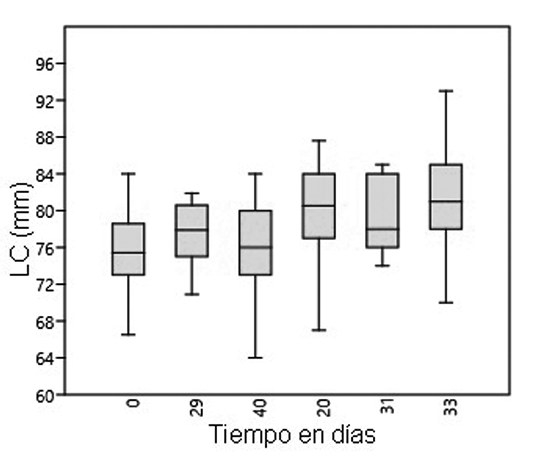 Durante este período se observaron dos etapas de crecimiento diferenciadas estadísticamente en el peso de la langosta (ANOVA, p < 0.01), de 0 a 69 días y de 70 a 153 días, evidenciadas por la prueba de Man-Whitney para pares de valores p, con el método de Bonferroni para valores p corregidos (Figura No. 2); la longitud del cefalotórax (LC) (Figura No. 3), manifestó un incremento de 6.1 mm para el mismo periodo (Figura No. 3) y la longitud total (LT) un incremento de 18.3 mm (Figura No. 4).