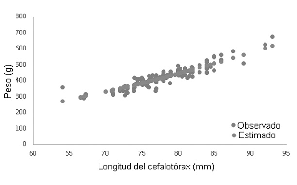 Donde W es el peso de la langosta (g), LC es la longitud cefalotórax en mm, a y b, son coeficientes de ajuste lineal.